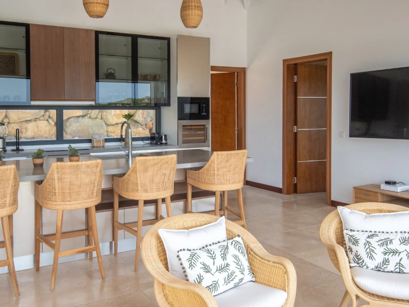 Les deux suites élégantes, chacune dotée de leur salle de bain privée, offrent confort et intimité, tandis que la décoration soignée marie design contemporain et touches caribéennes. Le salon convivial et la cuisine moderne parfaitement équipée invitent à partager des instants précieux en toute simplicité et élégance.
