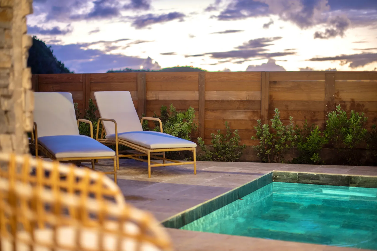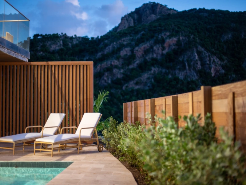 À l'extérieur, la piscine privée s'intègre harmonieusement dans une terrasse aménagée, véritable oasis de détente. L'espace extérieur propose différents espaces de vie : un coin repas pour des déjeuners conviviaux, et des zones de repos idéales pour se prélasser au soleil ou savourer la brise marine.